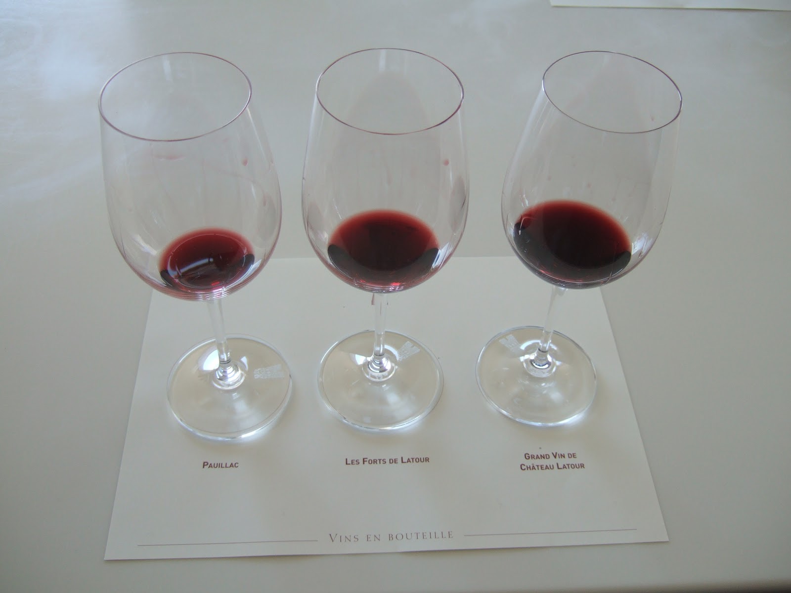 | The overhead light helps to gauge the gradation of the wine's colors, you also see limestone brick from the original structure of the Chateau. |
